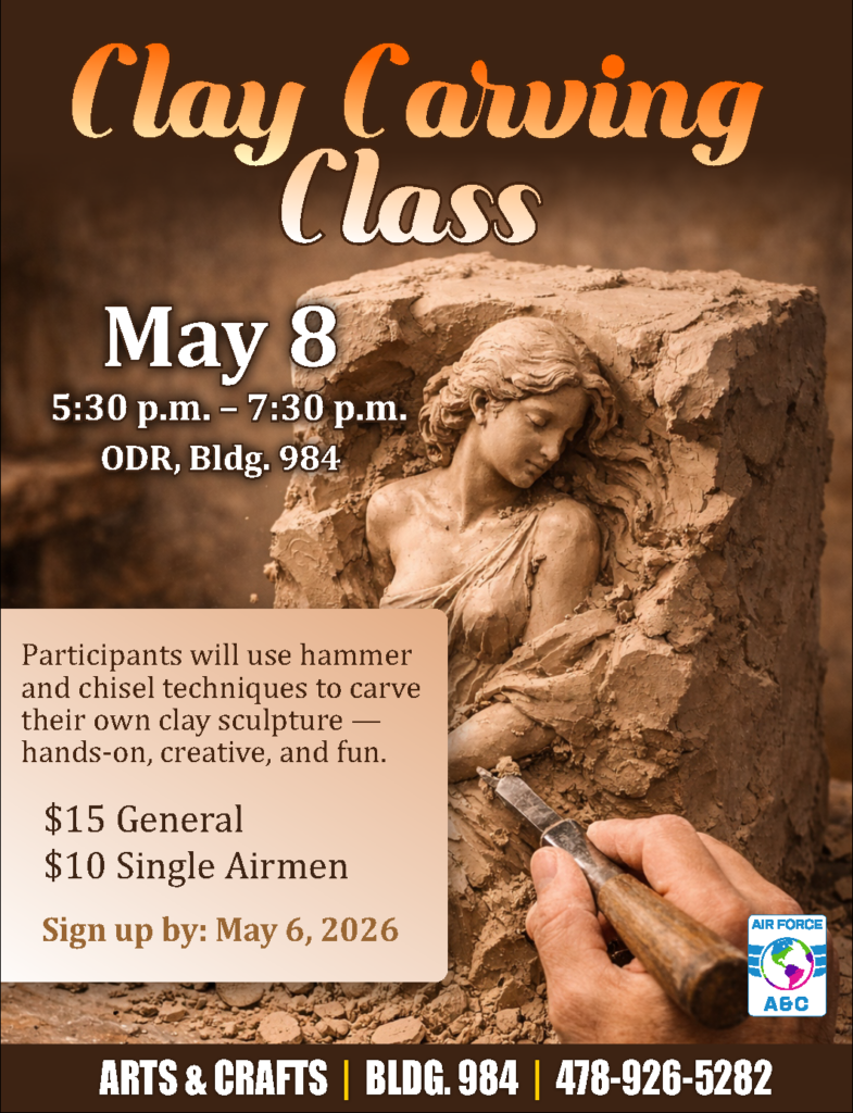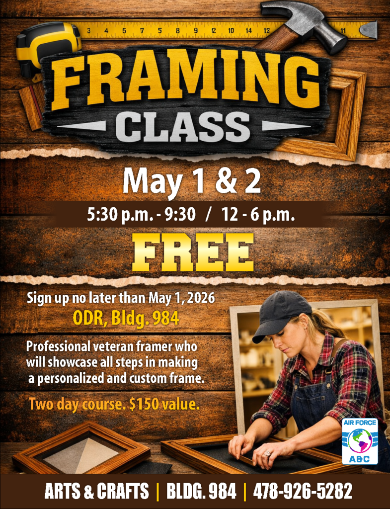 Enhance your craftsmanship skills with our two-day Framing Class at Arts & Crafts. Scheduled for May 1 and May 2 at ODR, Building 984, this free workshop provides participants with hands-on instruction from a professional veteran framer. Attendees will learn the complete process of designing and building a personalized, custom frame from start to finish. This course offers exceptional value, with instruction and experience typically worth $150 available at no cost. Ideal for beginners and DIY enthusiasts alike, the class focuses on practical techniques you can use long after the workshop ends. Participants will gain confidence working with tools and materials in a guided environment. Space is limited and registration is required. Sign up no later than May 1, 2026, by calling 478-926-5282.