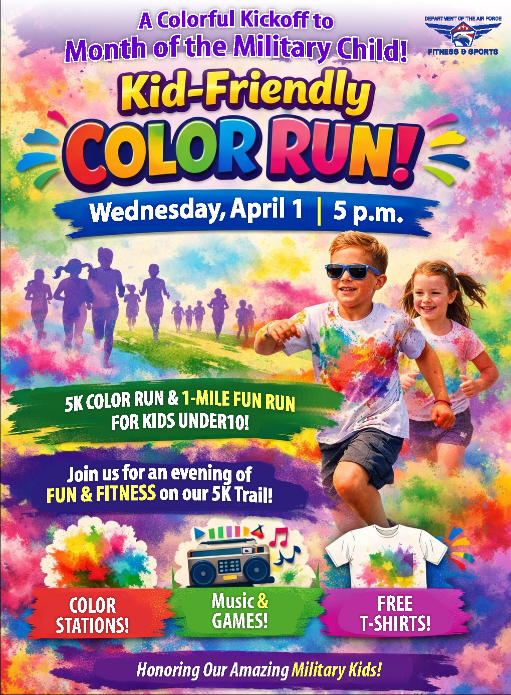 Celebrate the Month of the Military Child with a vibrant and exciting Kid-Friendly Color Run on Wednesday, April 1 at 5 p.m. This high-energy event features a 5K Color Run and a 1-mile fun run designed especially for children under 10, creating the perfect opportunity for families to enjoy fitness and fun together.